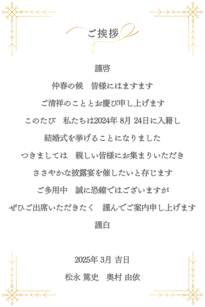 以下のアンケートの回答は任意です ご回答いただいた内容を披露宴にてご紹介 させていただく場合がございます なお、ご紹介の際に回答者の 名前を出すことはございません ご協力をお願いいたします